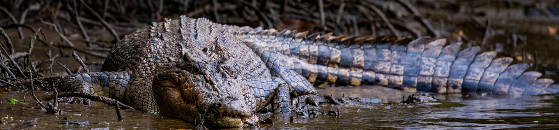 During the peak of the day, more specifically during the wet season (when the weather is a little cooler) is a generally good time to spot them on the banks. Crocodiles are cold blooded and need to regulate their body temperature to stay around 30 degrees, so they will bask on the river banks to warm up their bodies in the direct sun, before plunging back into the water.